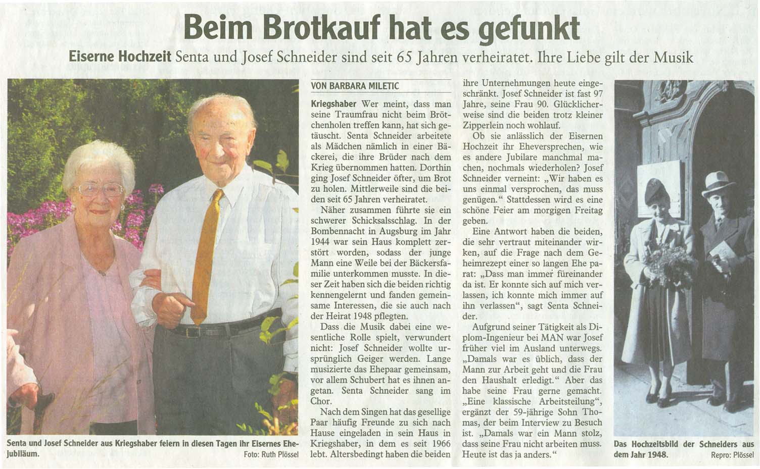 Eiserne Hochzeit Senta und Josef Schneider (AZ WA 26-Sep-2013)