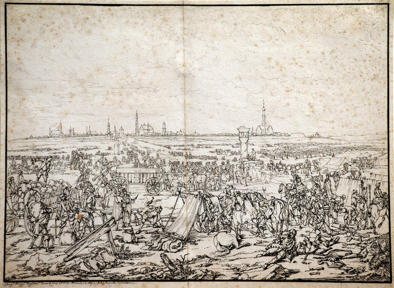 Schefold 40397: Belagerung von Augsburg durch die Franzosen und Bayern im Spanischen Erbfolgekrieg. Bez. l unten: 2Georg Philipp Rudgendas Invent. pinx et delin Anno 1704 Ad. 21. Febr. Augusta Vindelicorum" Kat. Augsburger Barock 1968, Nr. 324. Augsburg StKunstSlg (G 1703)