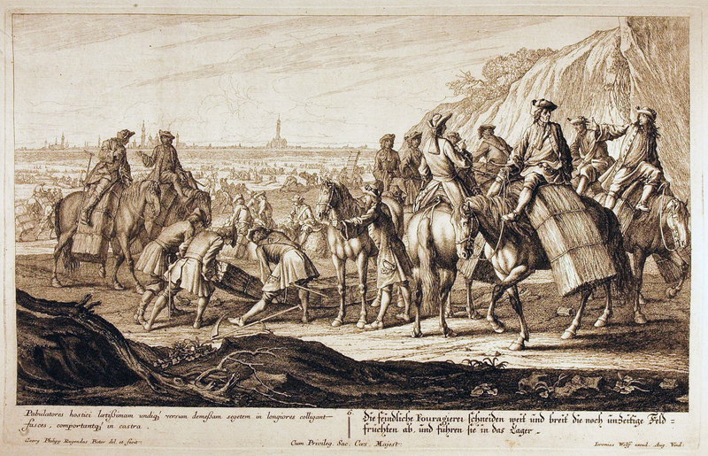 Schefold 40403: "6. Die feindlichen Fouragiere schneiden weit und breit die noch unzeitigen Feldfruechten ab und führen sie in das Lager" Signatur "Georg Philipp Rudgendas Pictor del.. et fecit Jeremias Wolff excudit Sug. Vindl" Augsburg StBibl (56/105); Quelle: Staatliche Gemaeldesammlung Augsburg