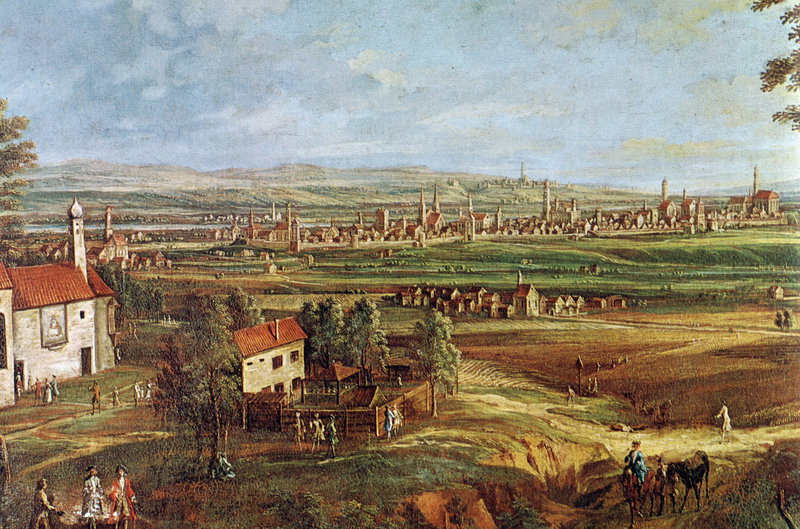 Schefold 40456: "Blick vom Kobel auf die Stadt, im Hintergrund ueberm Rathaus Friedberg. Von Jakob Christoph Weyermann 1730. Oel Leinwand 73x107 Augsburg StKunstsammlg" Im Mittelgrund Kriegshaber mit der Kapelle Maria Heimsuchung
