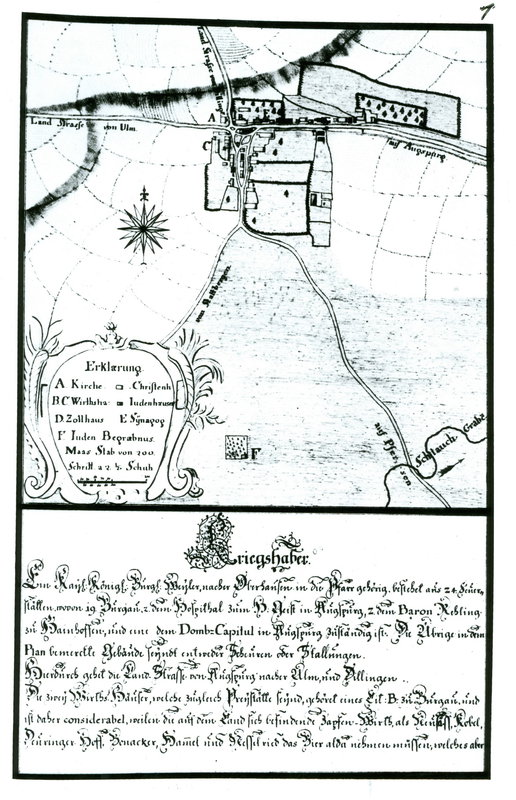Plan Kriegshaber 1750, Ausschnitt aus Buch Schwaebische Staedte und Doerfer um 1750 von Johann Lambert Kolleffel, Weissenhorn 1974, Seite 309