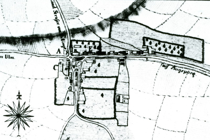 Plan Kriegshaber 1750, Ausschnitt aus Buch Schwaebische Staedte und Doerfer um 1750 von Johann Lambert Kolleffel, Weissenhorn 1974, Seite 309. Auschnitt bearbeitet