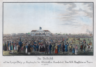 Schefold 42490: "Das Volksfest auf dem Exerzier Platze zu Augsburg bei der allerhoechsten Anwesenheit Ihrer K.K Majestaeten von Bayern d. 30. August 1829 A naturum del. et lith. d. Kornmayr A.V." Augsburg StKustSlg (G 20629)