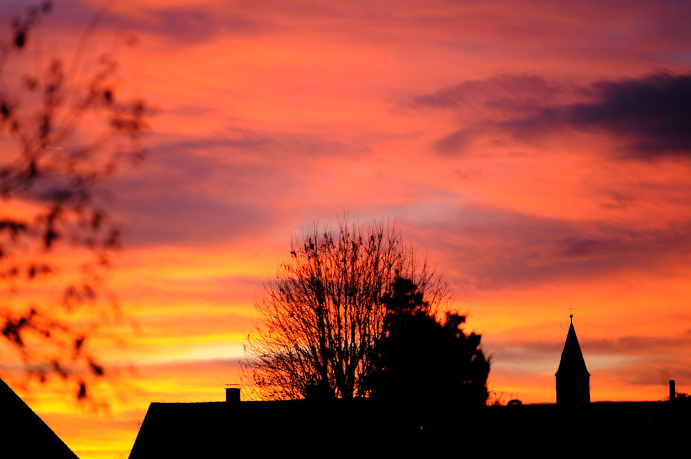 Augsburg-Kriegshaber: Abendrot über Kriegshaber mit Turm der Kirche 2010