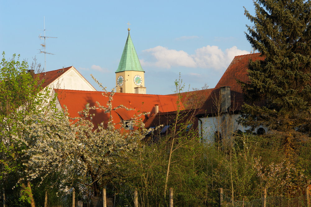 Augsburg-Kriegshaber: Rückseite der ehemalien Synagoge mit Turm der Dreifaltigkeitskirche 2010