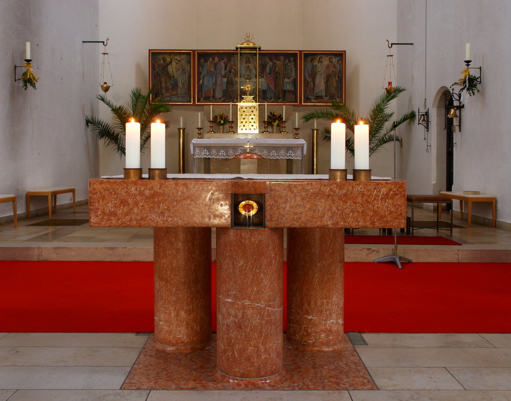 Augsburg-Kriegshaber: kath. Kirche Hlst. Dreifaltigkeit: Hauptaltar und vorne Volksaltar 2010