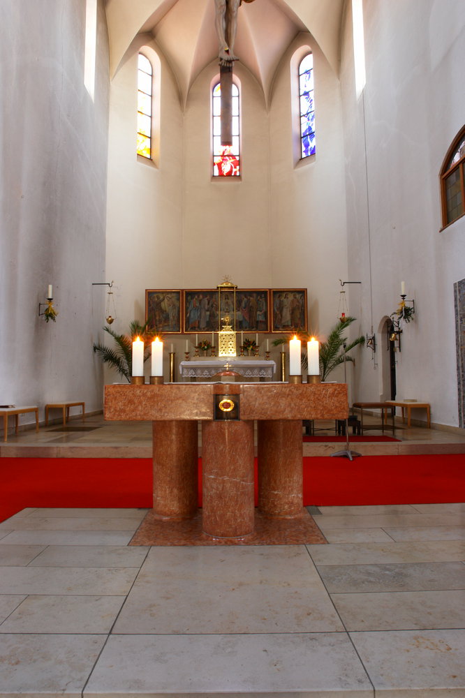 Augsburg-Kriegshaber Kirche Hlst. Dreifaltigkeit, Hochaltar, Apsisfenster fon Georg Bernhard, vorne Volksaltar 2010