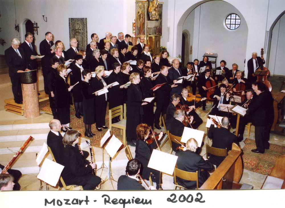 Kirchenchor Hlst. Dreifaltigkeit: Konzert Mozart Requiem 2002 mit Theo ThalmeirKonzert Mozart Requiem 2002: Chorsänger 1.R.: Gitta Kienle, Hilde Off, ?, Fanny Reitmeier, Hermine Bauer, Margaret Obers, Monika Böhm, Evi Klotz; 2.R.: Hanna. Leitenmeier, Elisabeth, Aich., Elfriede Möhler, Emmi Fink, ?, Edeltraut Heller, Felizitas Wember, X. Büsch; 3.R.: ?, Susi Klotz, Willi Obers, Walter Steger, Siegfried Off, Bernhard Wulf, Niko; Horsch; 4.R.: Erwin Neher. Gschwandner, ?, Klaus Off, Heinz Wember, Edwin Baier; 5.R.: Peter Hafner, Rudi Riegl, Josef Möhler; Solisten: Monika Weisser, Henrike Paede, Rammel, Wolfgang Straub; Leitung: Theo Thalmeir;