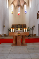 Augsburg-Kriegshaber Kirche Hlst. Dreifaltigkeit, Hochaltar, Apsisfenster fon Georg Bernhard, vorne Volksaltar 2010