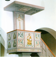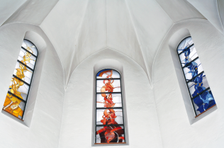 Kirchenfenster im Altarraum. Gestaltet von Georg Bernhard. 1989