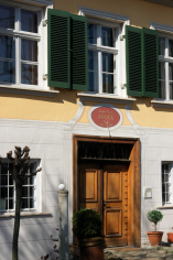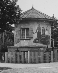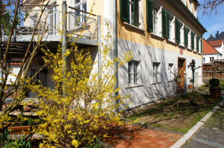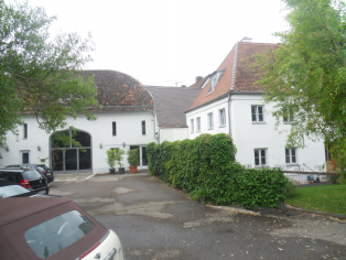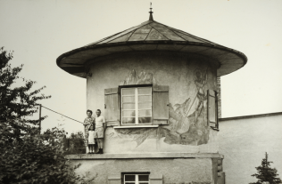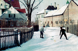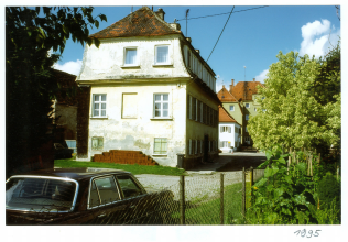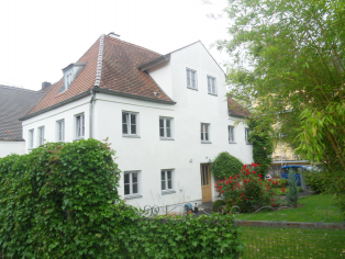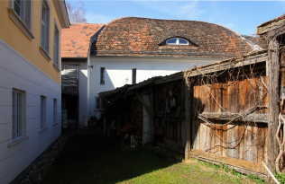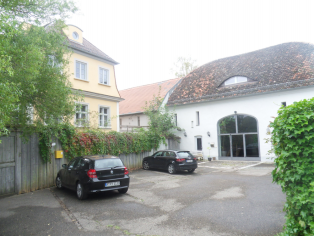 Hofeinfahrt 1963 mit Blick in die Schärtlstrasse. Rechts die Stallungen und Wohnhaus der ehemaligen jüdischen Familie Einstein, die als Viehhändler in Kriegshaber tätig waren.