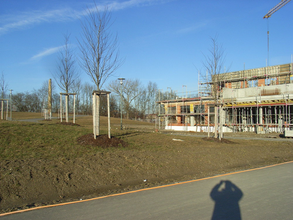 Kriegshaber: der neu angelegte Park noerdlich des neu angelegten Weihers, Baustelle fuer das geplante Cafe, 2008