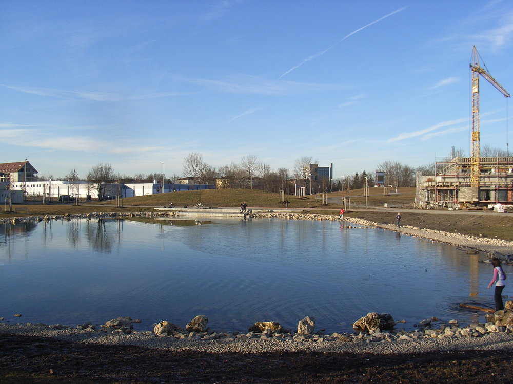 Kriegshaber: der neu angelegte Weiher, das hohe Wohnhaus ist das Schwesternhaus des ehemaligen Westkrankenhauses (frueher im Gelaende der Reese-Kaserne), 2008