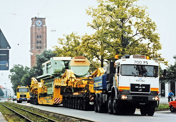 Schwertransport von MAN-Schiffsdiesel vor St. Thaddaeus 1985