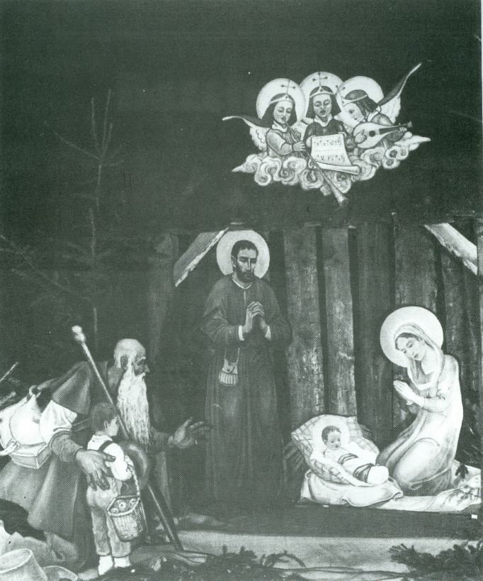Kalender Kriegshaber 1985 Die selbstgemalte Weihnachtskrippe der Pfarrei (Hlst. Dreifaltigkeit) in den Dreissiger Jahren. Die Figuren wurden vom damaligen Mesner Kaspar Thalmeir mit der Laubsaege ausgeschnitten, bemalt wurden die Figuren vom Kunstmaler Karl Radinger, der Stall wurde von Schreinermeister Erwin Schwab gemacht.