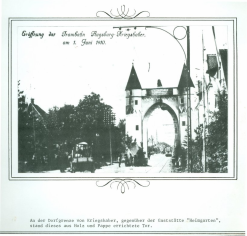 Kalender Kriegshaber 1985 An der Dorfgrenze von Kriegshaber, gegenueber der Gaststaette "Heimgarten" stand dieses aus Holz und Pappe errichtete Tor.