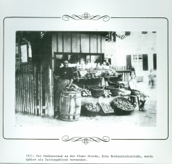 Kalender Kriegshaber 1985 1911: Der Gemuesestand an der Ulmer Strasse, Ecke Rockensteinstrasse, wurde spaeter als Zeitungskiosk verwendet