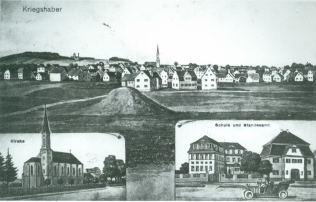 Kalender Kriegshaber 1985 Eine Postkarte aus dem Jahre 1915. Die neugotische Kirche, die 1906 gebaute Maedchenschule mit Zollhaus (damals Standesamt und Polizeistation), Blick von Sueden auf Kriegshaber mit Kobel, vorne ein Kugelfang des Grossen Exerzierplatzes.