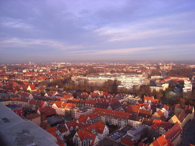 Blick vom Turm der Ulrichskirche in Augsburg, 2006: nach NNO mit City-Galerie und Oberhausen