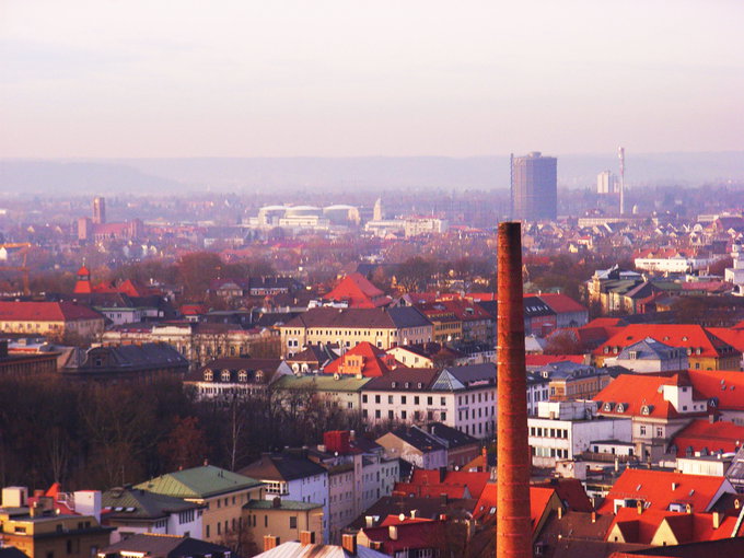 Blick vom Turm der Ulrichskirche in Augsburg, 2006: nach NW mit Kriegshaber (St. Thaddaeus) und Oberhausen (Gaskessel)