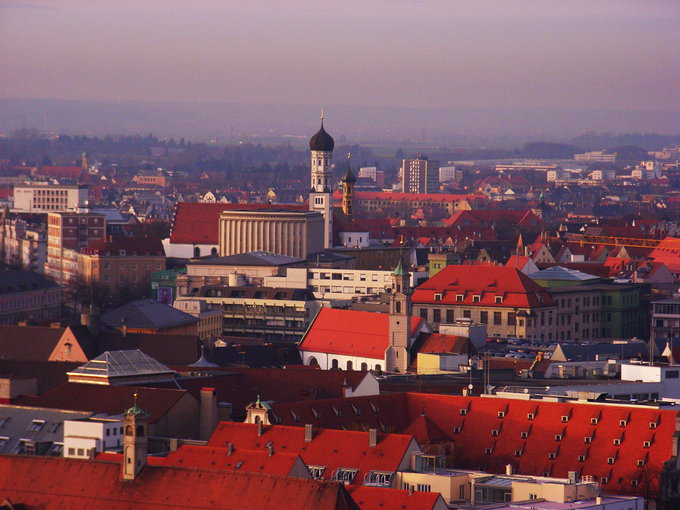 Blick vom Turm der Ulrichskirche in Augsburg, 2006: nach NNW Heiliggeistkirchen und Theater