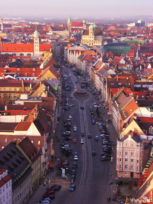 Blick vom Turm der Ulrichskirche in Augsburg, 2006: nach N Maximilianstr. St. Moritz, Dom, Perlachturm und Rathaus