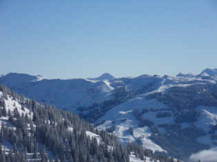 Brixen in Thale: Skigebiet Westendorf, Aussichtsplattform, nach N, Schlierseer Berge, ganz links Sonnwendjoch, Rotwand und Miesung