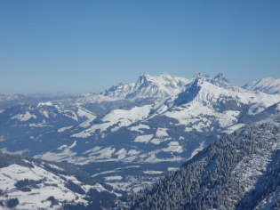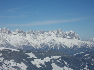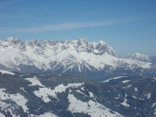 Brixen in Thale: Skigebiet Westendorf, Aussichtsplattform, nach NO Wilder Kaiser: Ellmauer Haltspitze, Karlspitze, Ellmauer Tor, Goinger Halt (Hintere - und Vordere -), ... Ackerspitze, Mauthspitze,