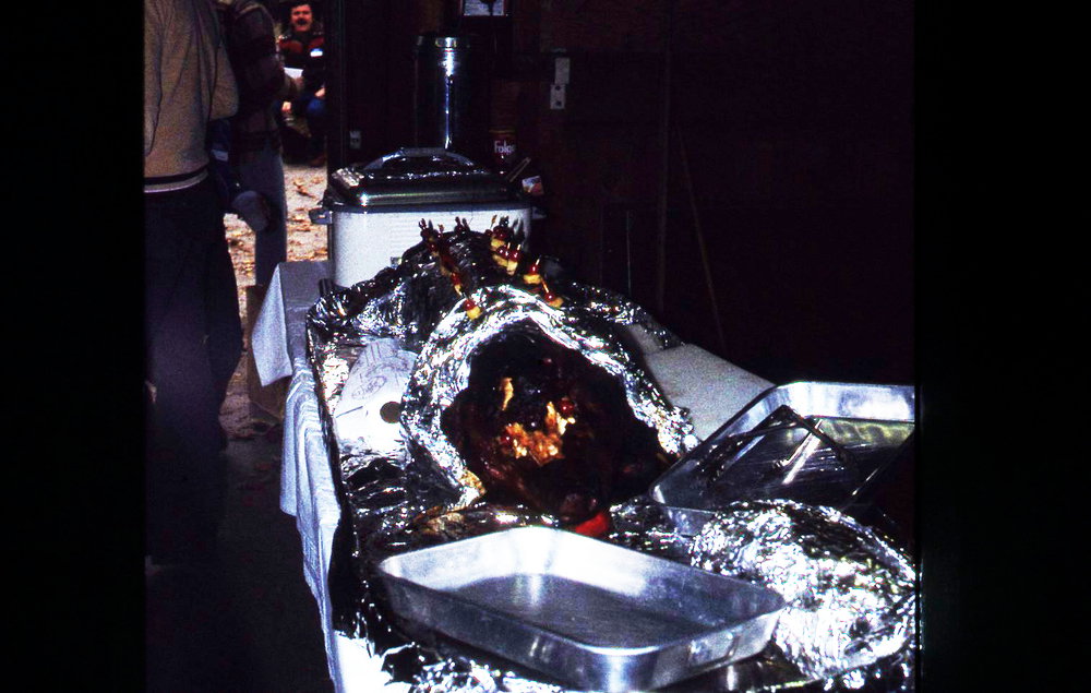 Grillparty der Programmierer von Material Control System das gegrillte Schwein